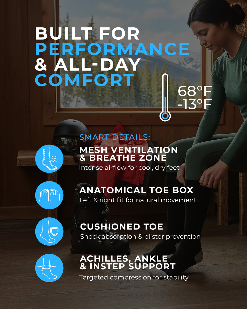 Mød dine vintereventyr med dameski-strømper i termisk uld, lavet af en luksuriøs blanding af merinould. Designet til at støtte dig fra den første lift til den sidste nedkørsel, tilbyder disse funktionsstrømper den perfekte balance mellem blødhed, varme og åndbarhed – ideelle til skiløb, snowboarding, vandreture eller blot at nyde kulden i komfort. Merinouldens naturlige temperaturregulerende og fugttransporterende egenskaber holder dine fødder varme og tørre uden overophedning, mens uldstrømpernes silkeagtige berøring føles blid mod huden, selv efter mange timer i støvlerne.Nyd den ekstra komfort fra ekstra polstring, som gør disse funktionelle strømper stærke i ydeevne og klar til bjergene – det er de lange strømper, din vintergarderobe har ventet på!