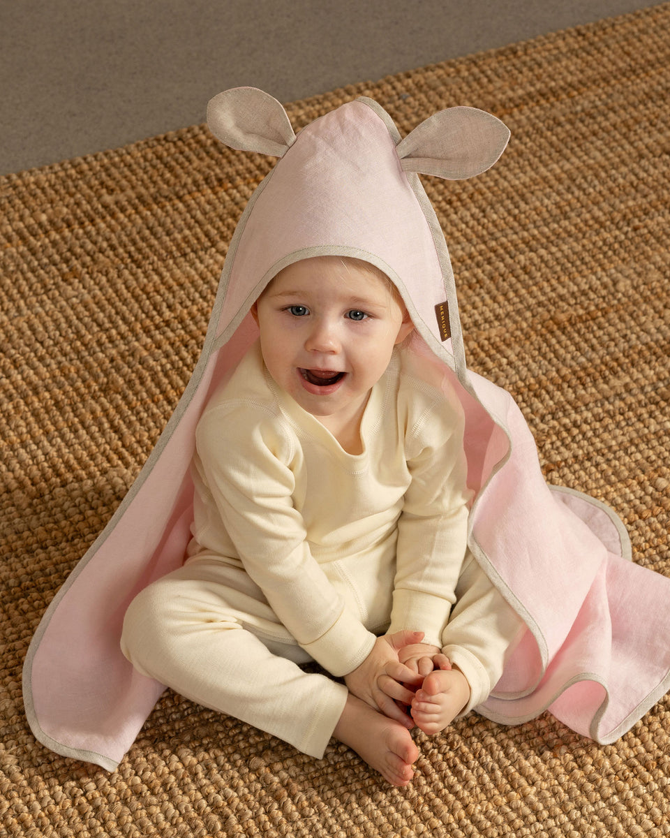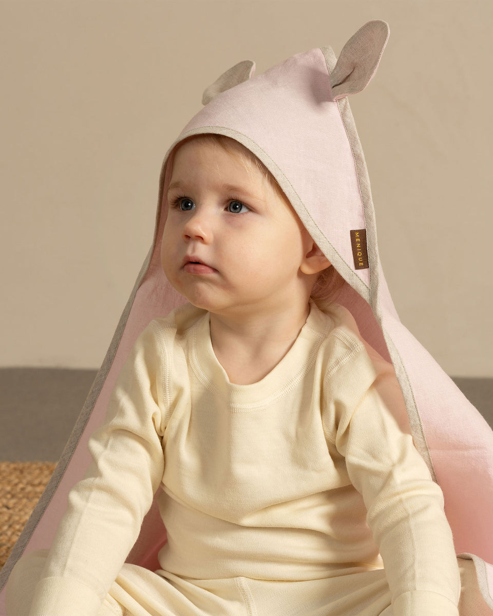 Disse søde badehåndklæder i hør til babyer har yndige ører for et legende design. Et 100 % hør hættehåndklæde hjælper med at suge overskydende vand fra babyens hår og fremskynder tørringsprocessen.