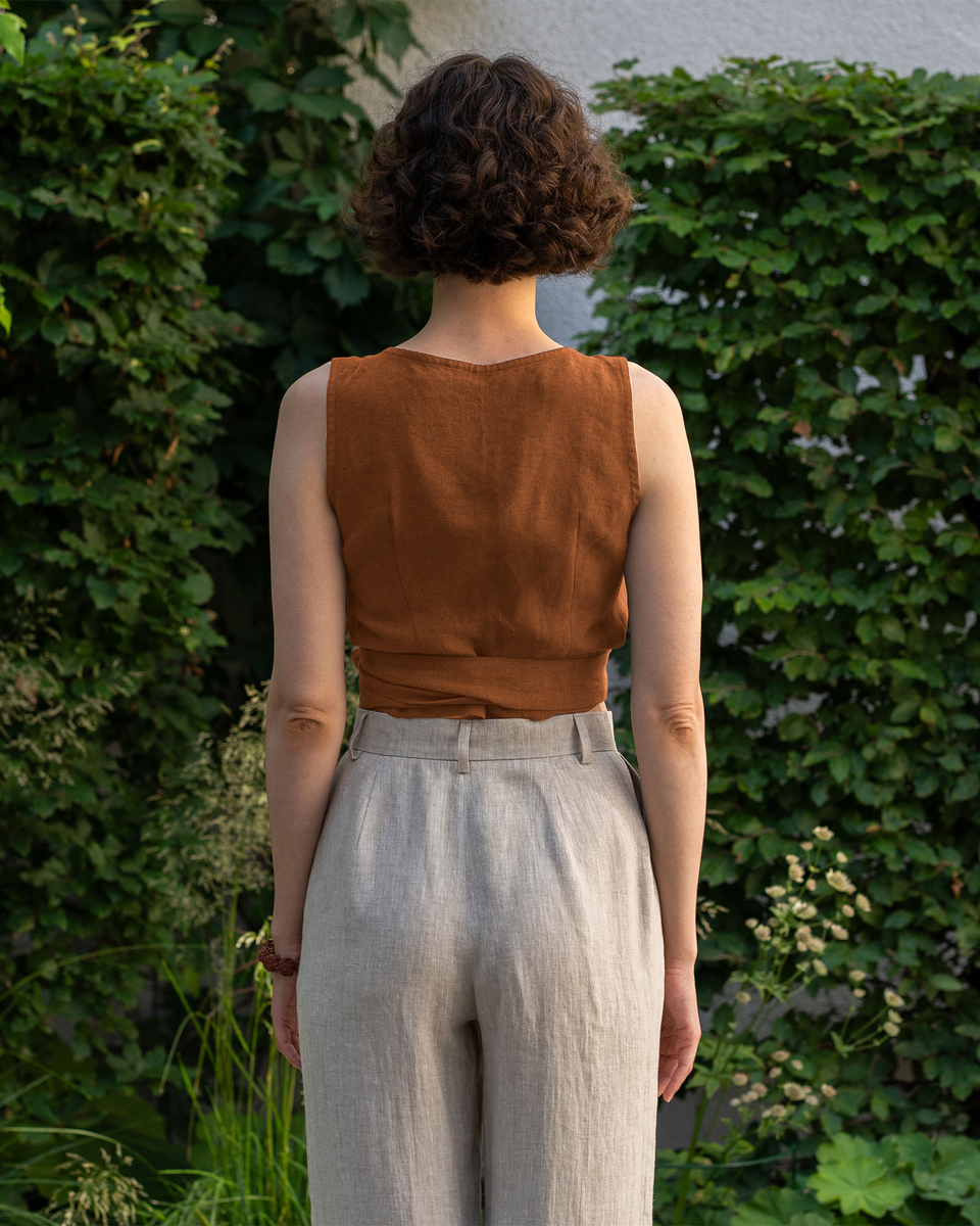 Bæredygtig hør-top i omslagsstil, som smukt tilpasser sig enhver stilfuld underdel. Det moderne design tilføjer et strejf af detaljer til din overkrop, samtidig med at det yndefuldt fremhæver din talje med et bælte, der vikles rundt. Style med vores Lotus-bukser eller Demi-shorts for et komplet bæredygtigt sæt til sommeren.