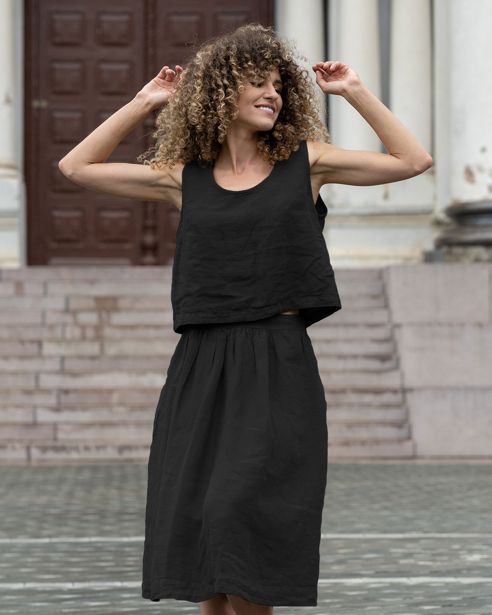 Vores hørnederdel er bæredygtigt fremstillet af 100% hørstof, hvilket gør den til det perfekte valg på de varmere dage. Hørstoffets høje åndbarhed holder dig kølig, frisk og tør, mens den bløde A-form, brede linning og to skjulte lommer giver ultimativ komfort til dine sommerdage.