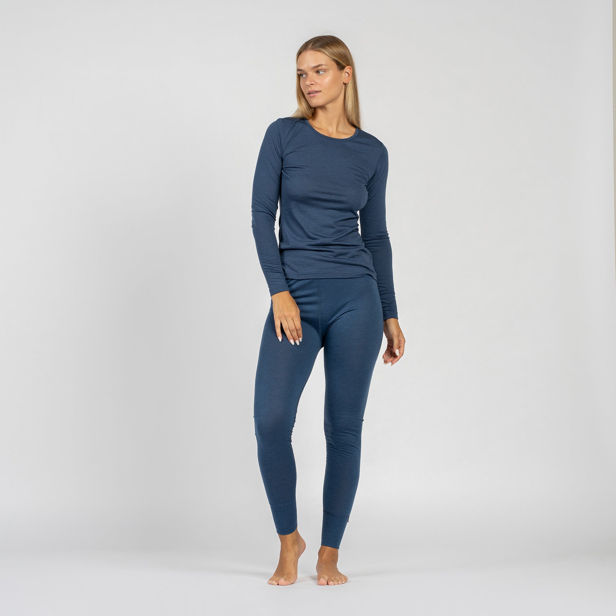 Sidet kig på kvinde iført termisk basislagssæt i royal kirsebær Merinould.