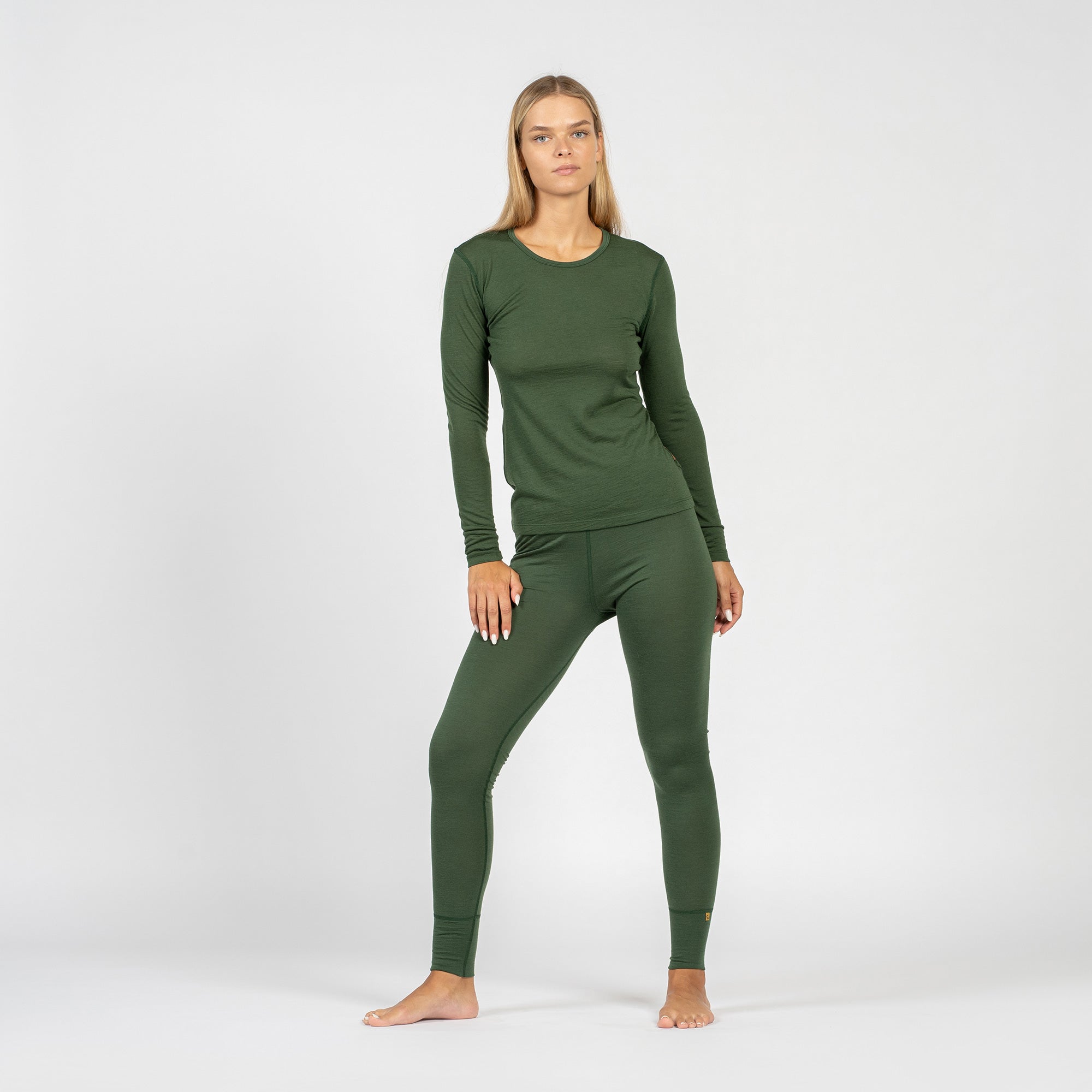 Den menique dame mørkegrønne langærmede bluse i merinould, matchet med menique mørkegrønne underdele, set forfra.