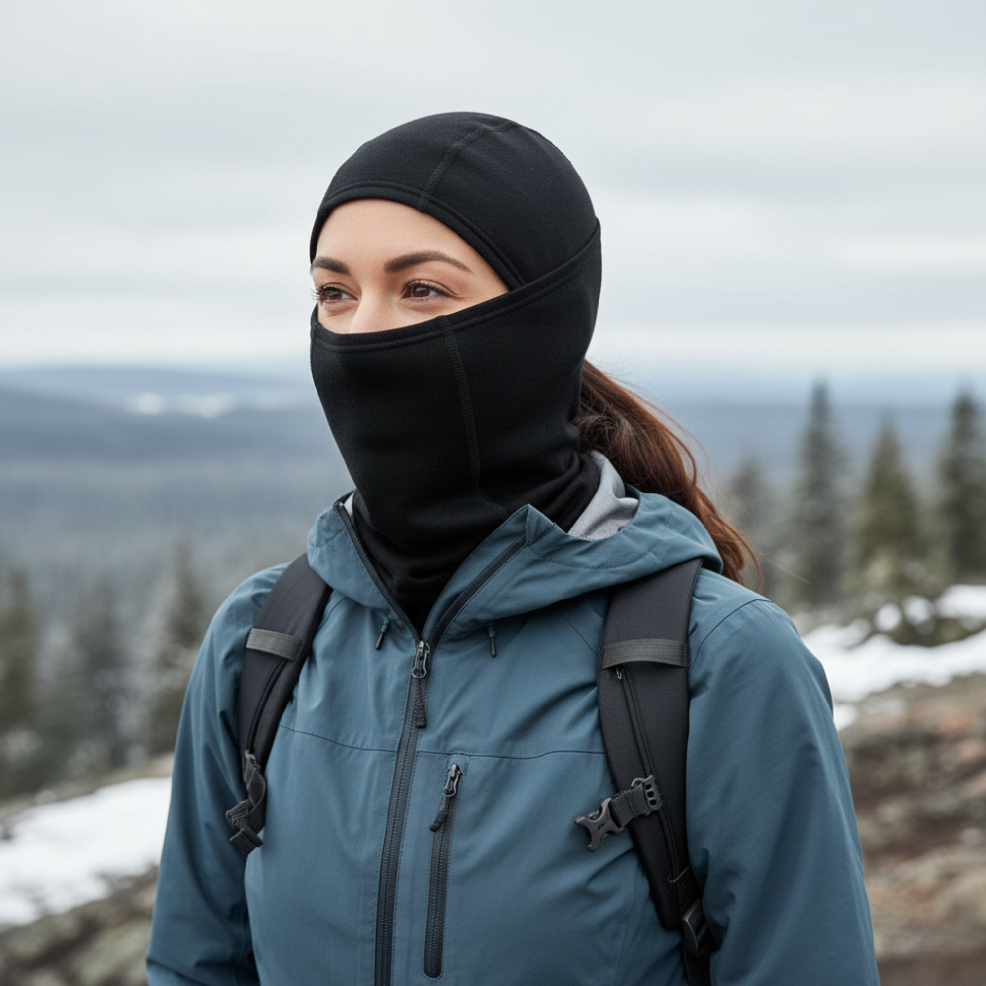 Kvinde iført en sort merinoulds termoundertøj under en skijakke i alpine forhold, der fremhæver funktionslag og komfort i koldt vejr.