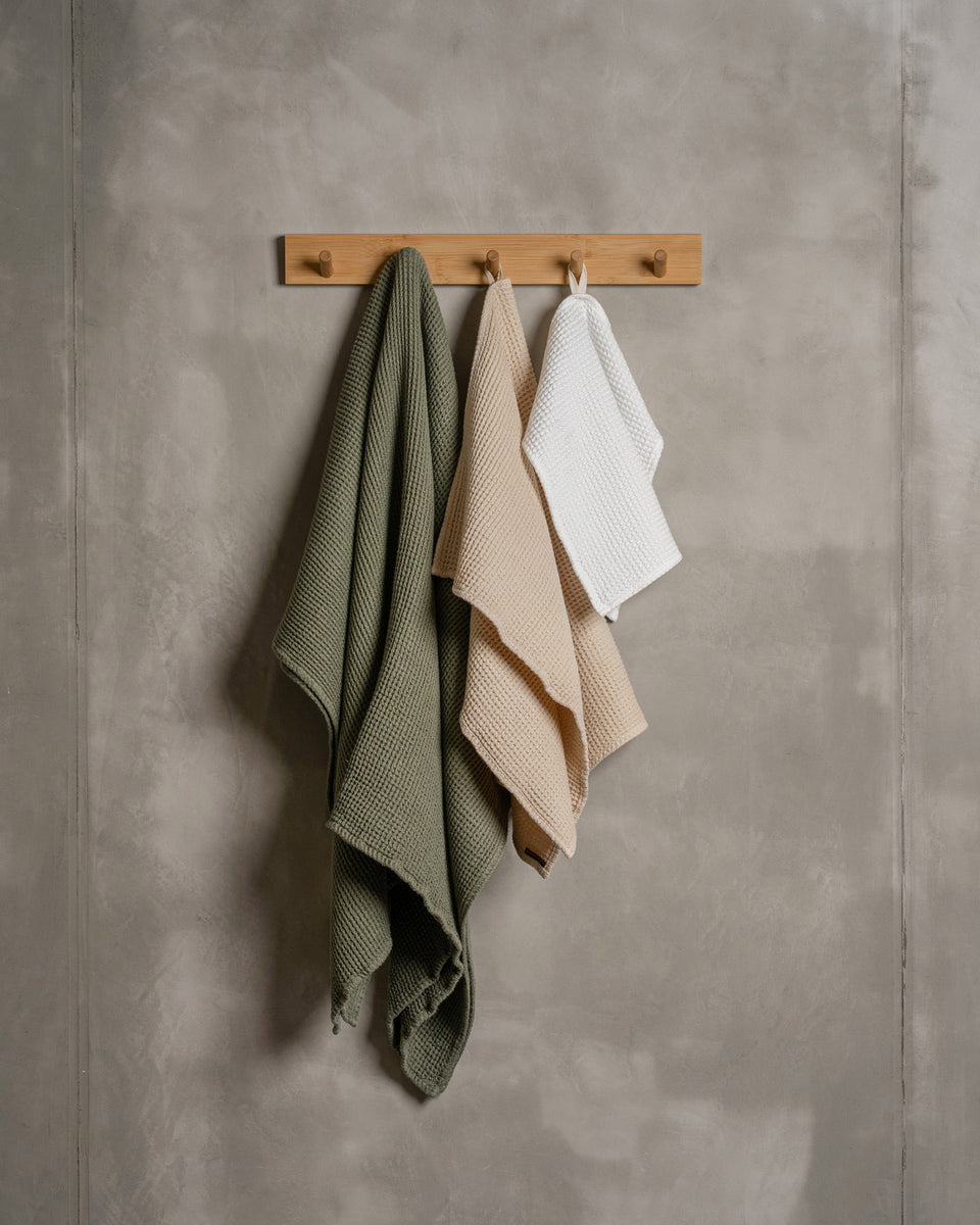 Waffle bath towels, available in face towel, hand towel, and sheet towel options, bring practical advantages to your bathroom routine. Crafted from linen with natural moisture-wicking properties, these towels boast high absorbency, enhanced by the waffle texture that maximizes surface area for faster drying. Designed for long-lasting durability, they retain their shape and texture even with frequent use and washing.