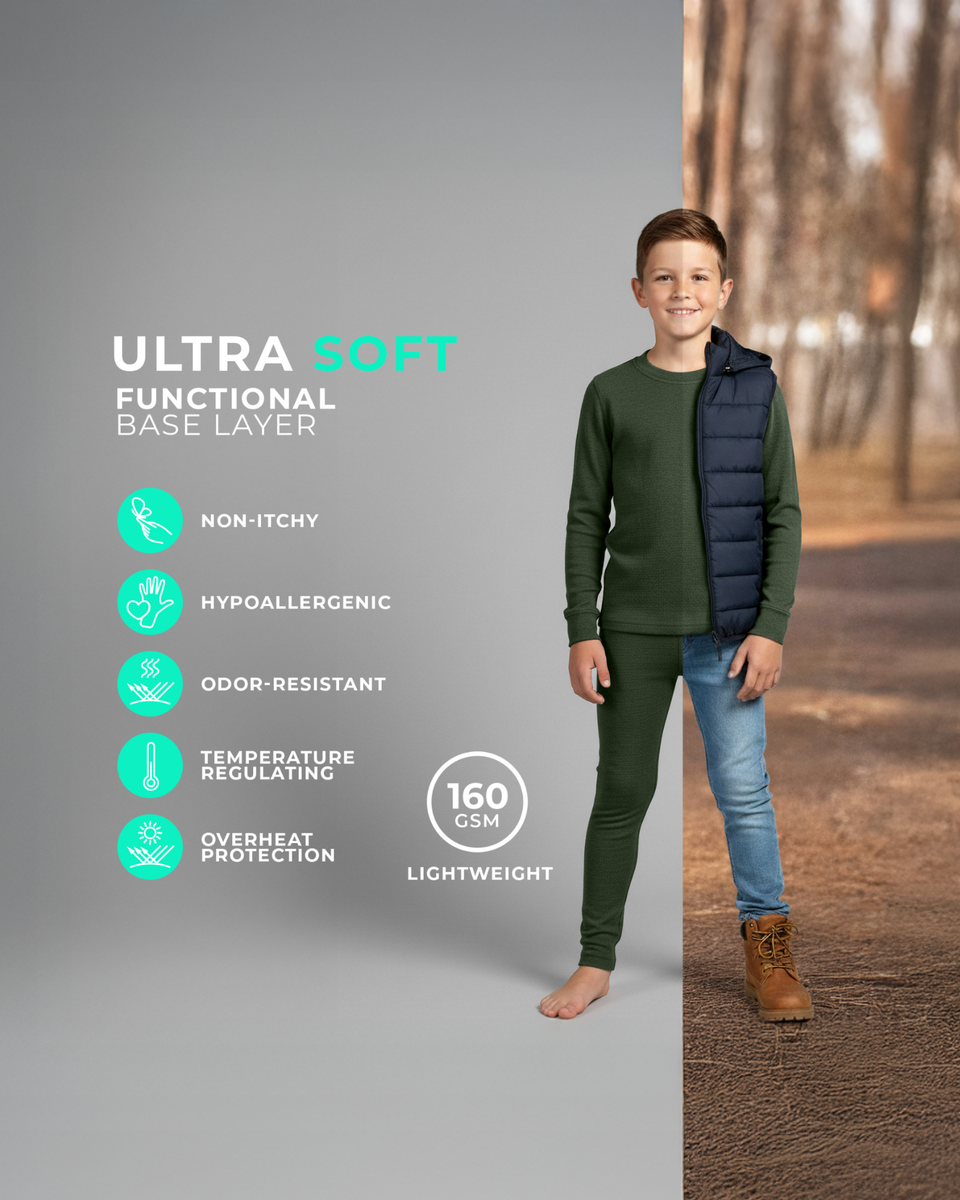 Introducing the 160gsm lightweight Merino long sleeve top and leggings—a comfortable and versatile choice for kids. This set works as pajamas, a base layer, or light summer wear, with a stretchy, breathable design that’s great for sports, casual wear, and active hobbies. Made from 100% pure Merino wool, it offers exceptional softness, temperature regulation, and natural odor resistance, ensuring your kids stay comfortable in all climates. Let your kids explore the world with ease in this practical, stylish set they'll never want to take off.