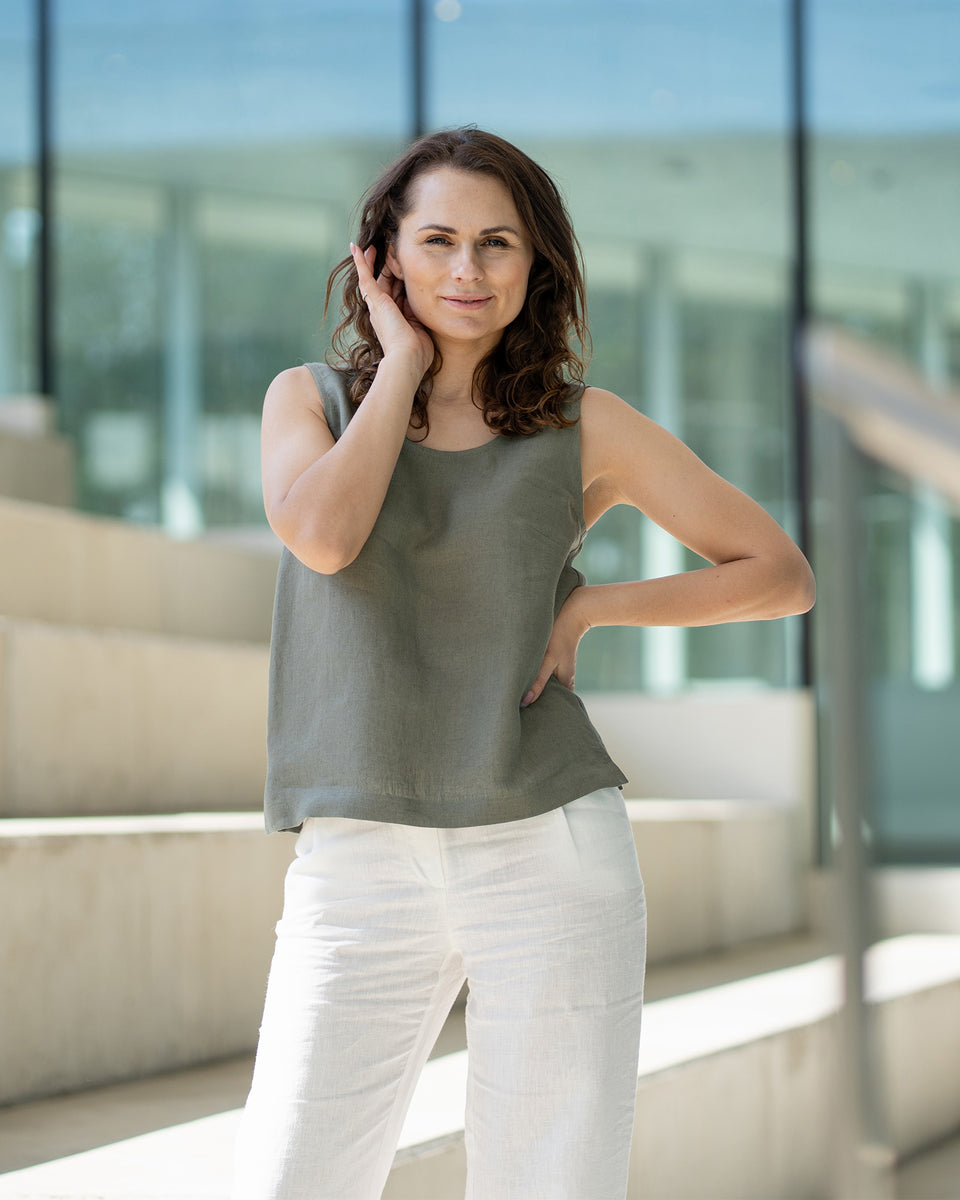 Hana tanktop er en luftig sommerbluse lavet af allergivenligt og økologisk 100% hørstof, som er kendt for at være yderst åndbart, fugttransporterende og sikkert selv for den mest sarte hud. Hør-tanktoppen har rund hals, afslappet pasform og lige snit. Med små slidser i begge sider er hørblusen den perfekte makker til vores højtaljede hørbukser Dakota eller nederdelen Sophia.