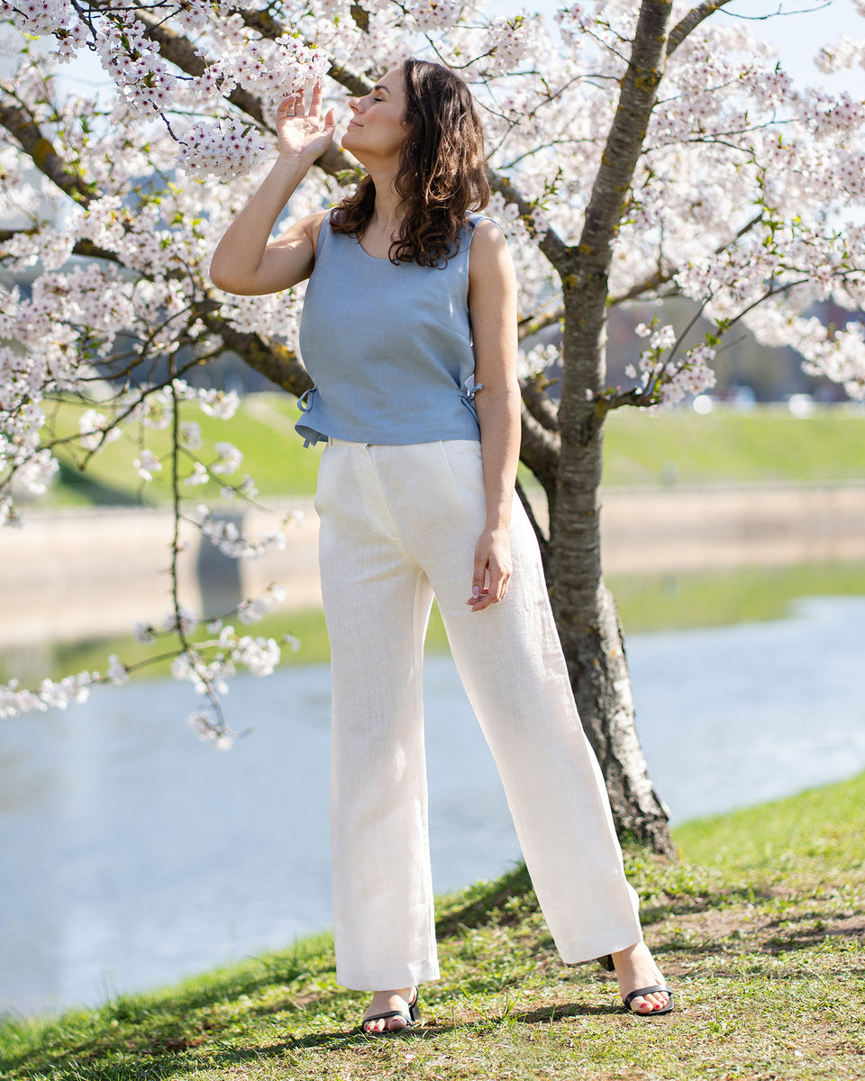 Fremstillet af 100% europæisk hør, viser vores korte bluse fine sidelommer, der bindes til yndefulde bånd og tilfører et elegant præg til dit sommerlook. Stilfuld og moderne, kombiner denne ærmeløse hørbluse med plisserede bukser, lange bukser eller shorts for et smart og eventyrklart sæt.