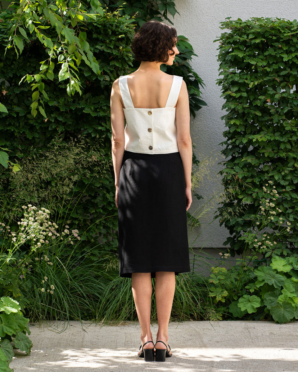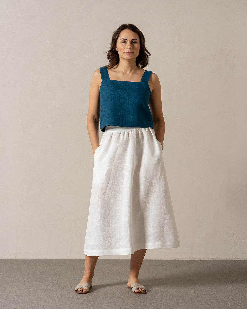 100% hør crop top er lavet af dobbelt 200gsm stof for et mere fast udseende. Med et ærmeløst design og firkantet halsudskæring er den ideel til at fremhæve dine skuldre og nyde solen. Den lige silhuet fremhæver din figur, og knaplukningen bagpå giver et unikt præg.